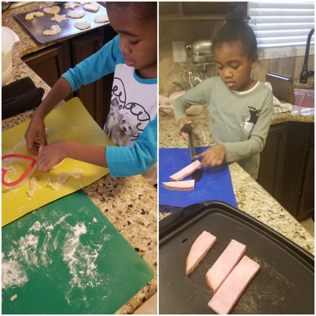A few of the past times I’ve been in the kitchen, I’ve let mini me “cook”. She has her age safe cooking utensils and I help her with the adult items, but I think her learning to cook now can help her in many ways later in life.